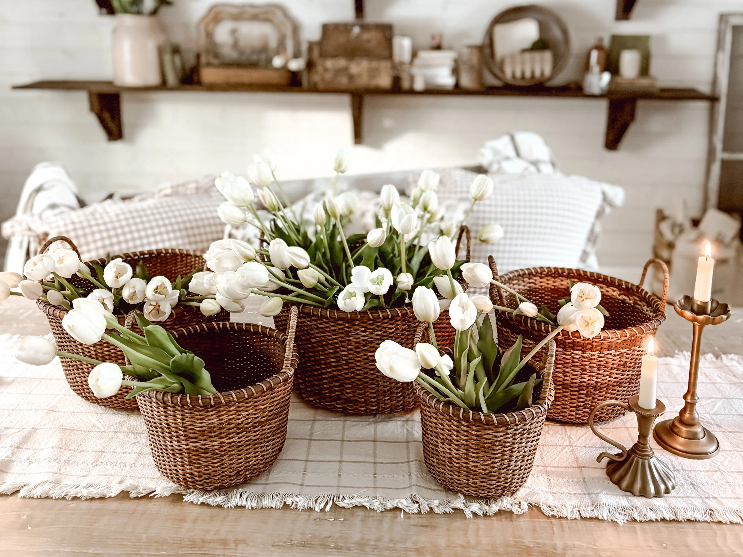 Fill them loosely with fresh tulips, garden clippings, or even faux stems for a layered, organic look. Cluster several sizes together down the center of your table for visual interest, or place a single larger basket as the focal point.