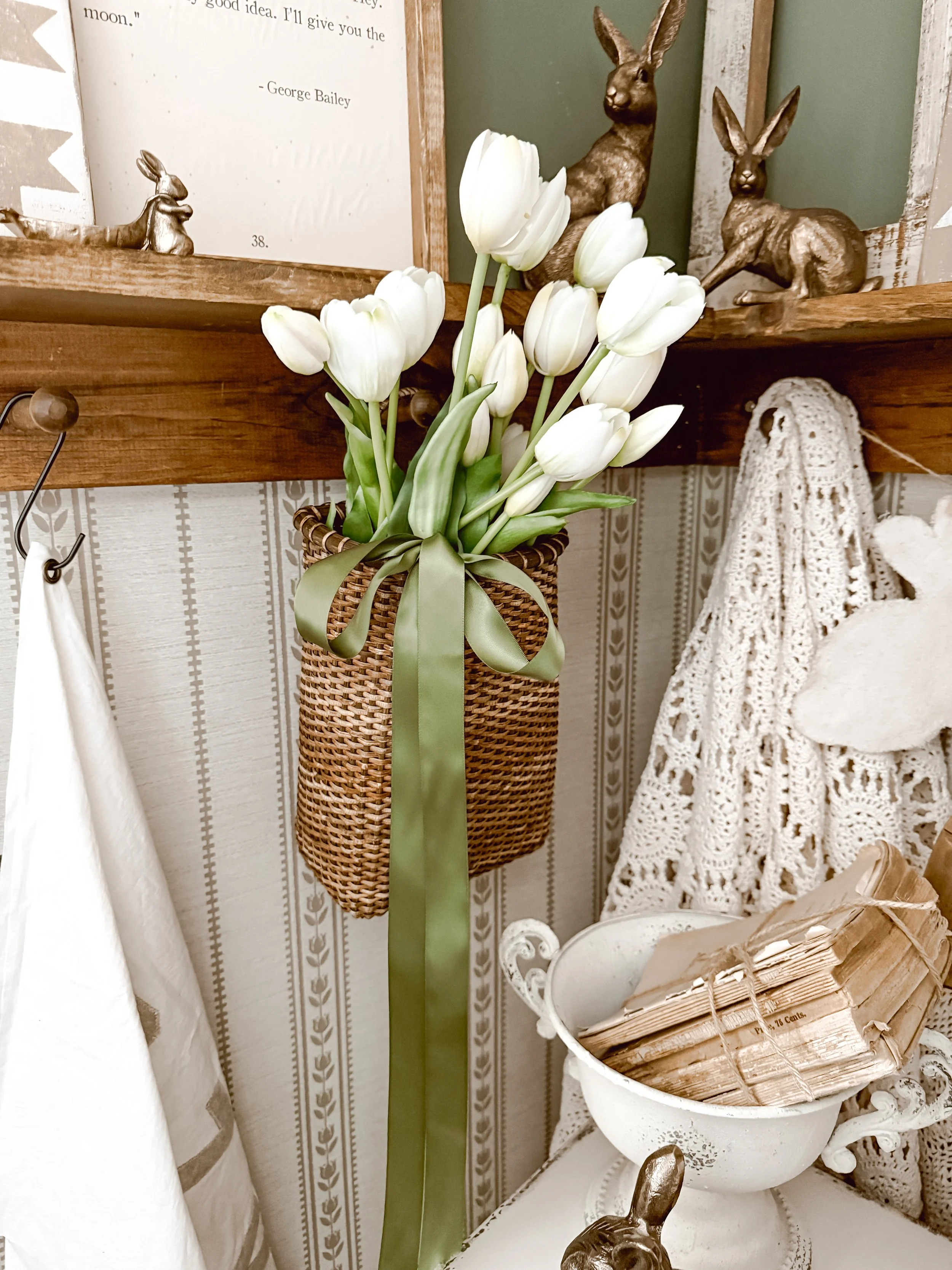 Their leather or wrapped handles make them perfect for peg rails or open shelving. Hang a basket filled with tulips, trailing greenery, or even rolled linens to add vertical texture to your walls.